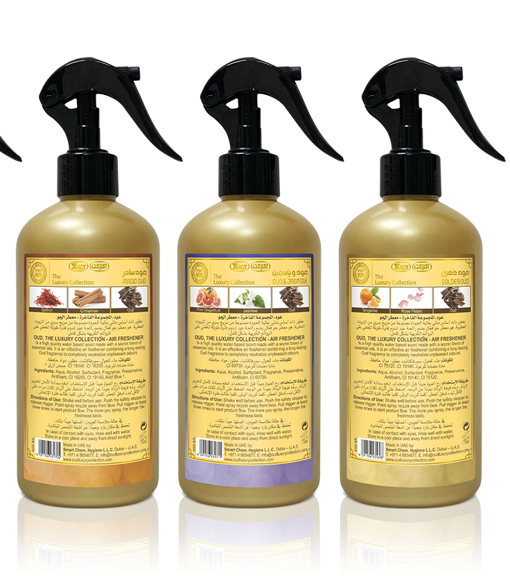 Our new Air Freshener is a high quality water based scent made with a secret blend of essential oils. It is an effective air freshener combining long-lasting Oud fragrance to completely neutralize unpleasant odors. This complete collection of 3 Scents will make your place smells so divine