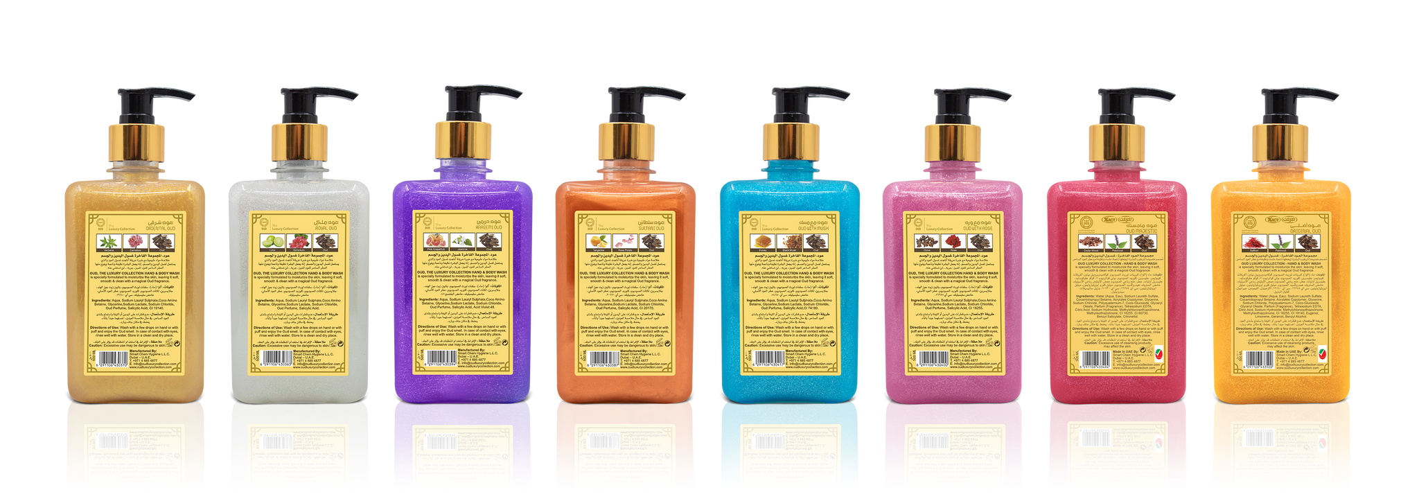 These luxurious soaps are made of a highly unique blend of natural ingredients and original Oud fragrances, leaving your skin soft, smooth and clean. All 8 Scents of 500ml