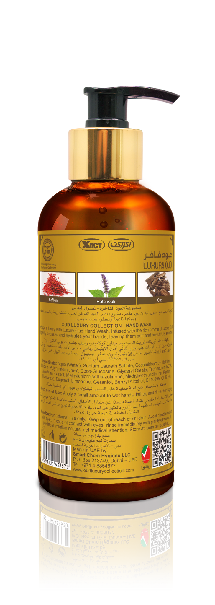 Enjoy the Oud Premium Hand Wash - Luxury Oud. This rich, woodsy blend with Oud leaves your hands feeling soft and clean. Enriched with Aloe Vera and Shea Butter, it provides a gentle and long-lasting fragrance